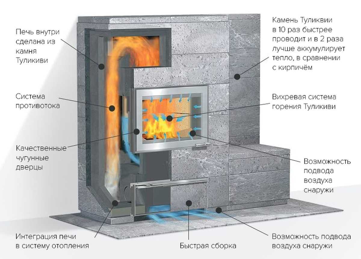 Финские печи Туликиви пользуются заслуженной популярностью у отечественного потребителя, предпочитающего экологически чистые и натуральные материалы. При их сборке используется талькомагнезит (другие его названия – сланец или стеатит), относящийся к природным минералам вулканического происхождения. Материал обладает уникальными свойствами, позволяющими аккумулировать тепло. По этому показателю сланец в 2,5 раза превосходит энергоемкий кирпич.