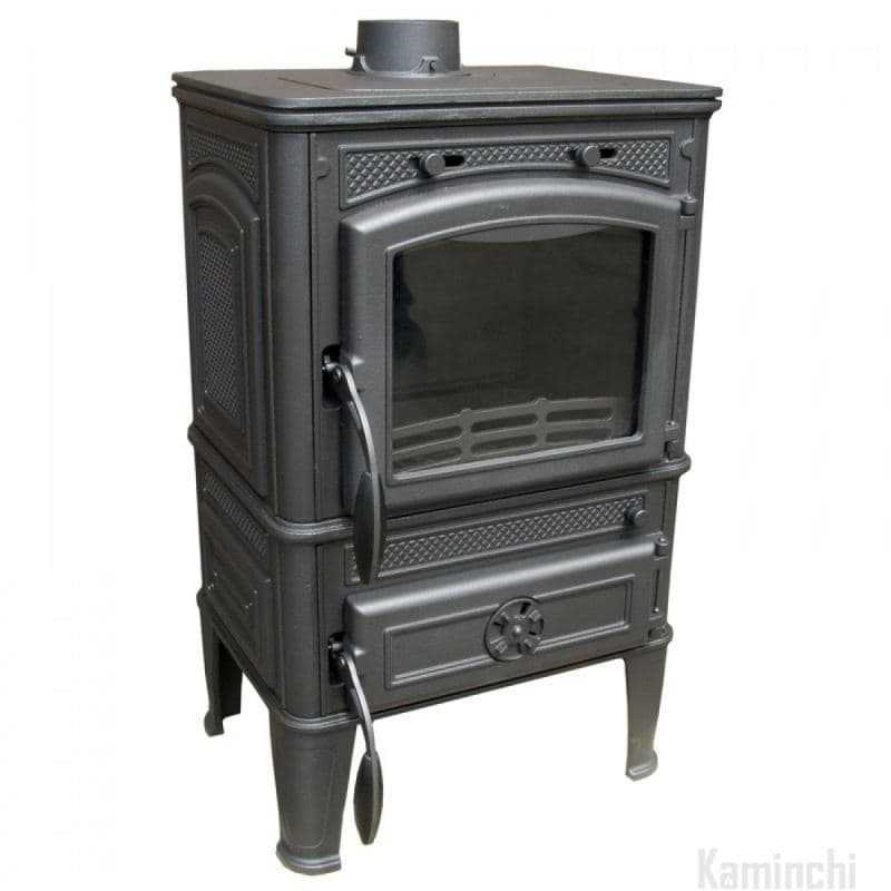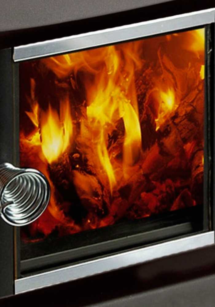 Дровяная печь с системой длительного горения. Оборудована наружной сеткой из нержавеющей стали. Дверка представляет собой большой стеклянный люк. В ней встроен хороший клапан регулировки тяги.