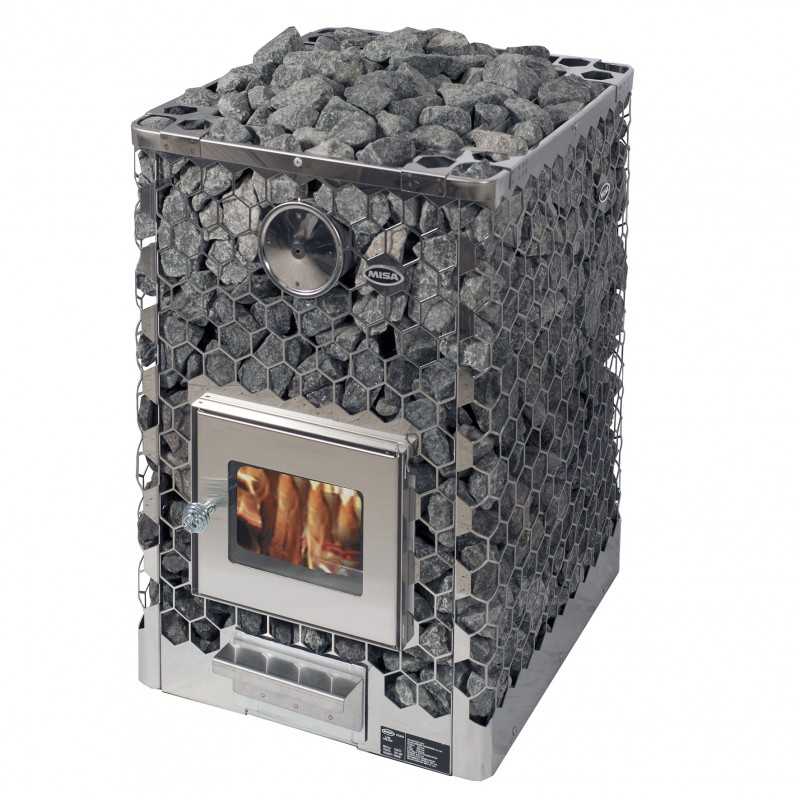 Дровяная печь с системой длительного горения. Выполнена из четырехугольной сетки из нержавеющей стали. Большой стеклянный люк на передней части хорошо освещает пол в парилке. Тяга регулируется поддувом. Скорость нагрева высокая. Температура камней варьируется в разных местах печи.