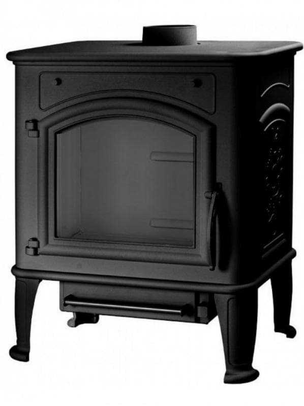 Стильная дровяная печь для напольной установки. Имеет закрытую конструкцию и дымоход. Мощность 16,5 кВт, рассчитана на помещение в 13 куб./м. Корпус стальной, включает ящик для золы.