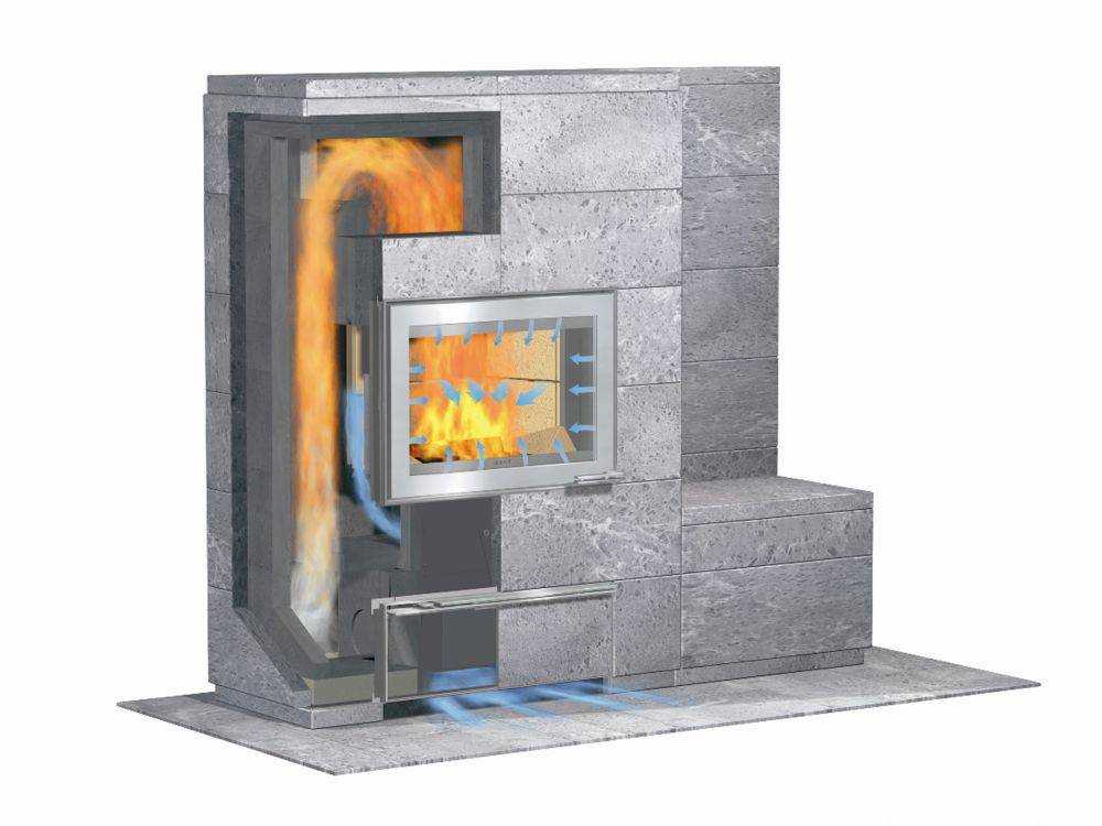Принцип работы такого типа устройств довольно прост. Прежде чем нагретый воздух попадет в дымоход, почти все тепло поглощается камнем, который может отдавать его в течении 48 часов. Производство тепла контролируется временем разгорания огня, а также типом древесины, используемой для сжигания. Можно использовать все виды дров с влажностью менее 20 процентов.