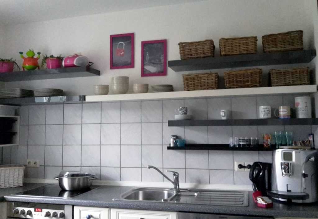 - Над кухонным столом. Идеальный вариант расположения — полочка на кухне над столом. При приготовлении пищи вся необходимая кухонная утварь находится под рукой.