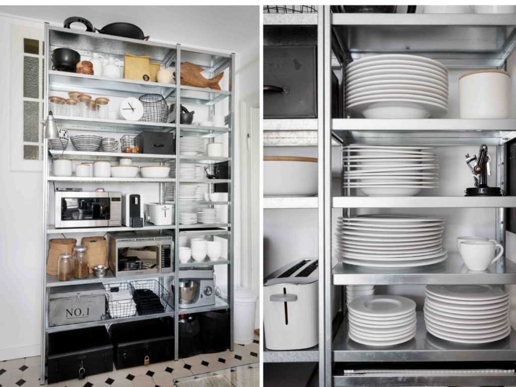 На фото интерьер столовой, оформленный открытыми полками до потолка.