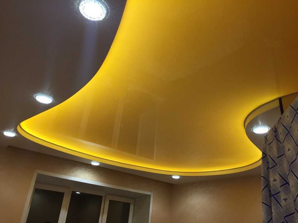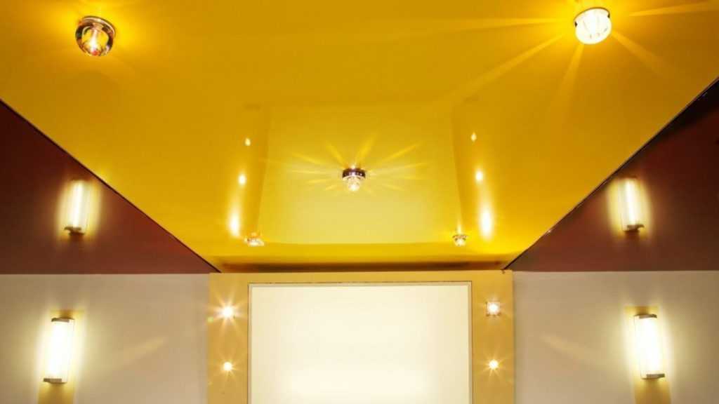 - Ограничение мощности осветительных приборов. Лампы, включенные на всю мощность, оставляют на потолочном полотне ореол желтоватого оттенка.