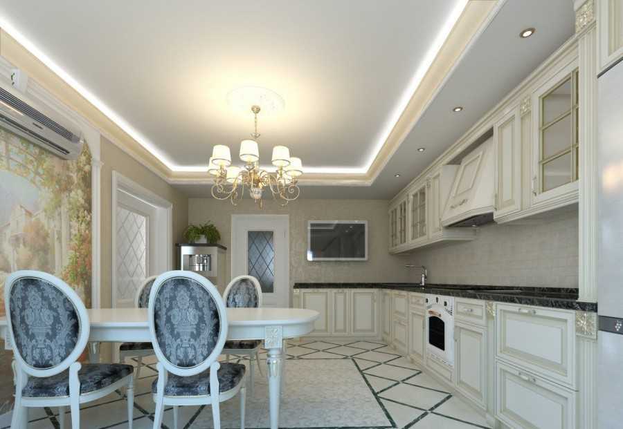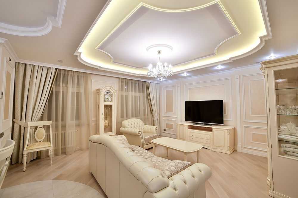 Потолки в классическом стиле могут быть двухуровневые, с подсветкой и с точечными светильниками
