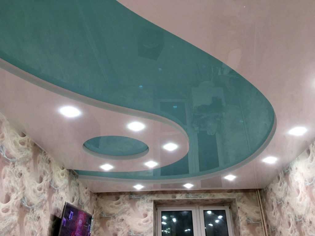 Чем меньше комната, тем проще должна быть конструкция двухуровневого потолка. Это касается и цвета полотна, а также наличия на нем рисунка.