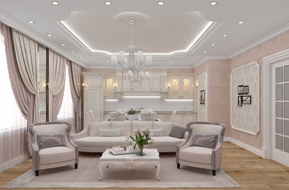 Классические потолки всегда имеют ровную, гладкую поверхность без дефектов и трещин. Самый распространённый цвет для потолков в рамках этого стиля – белый!