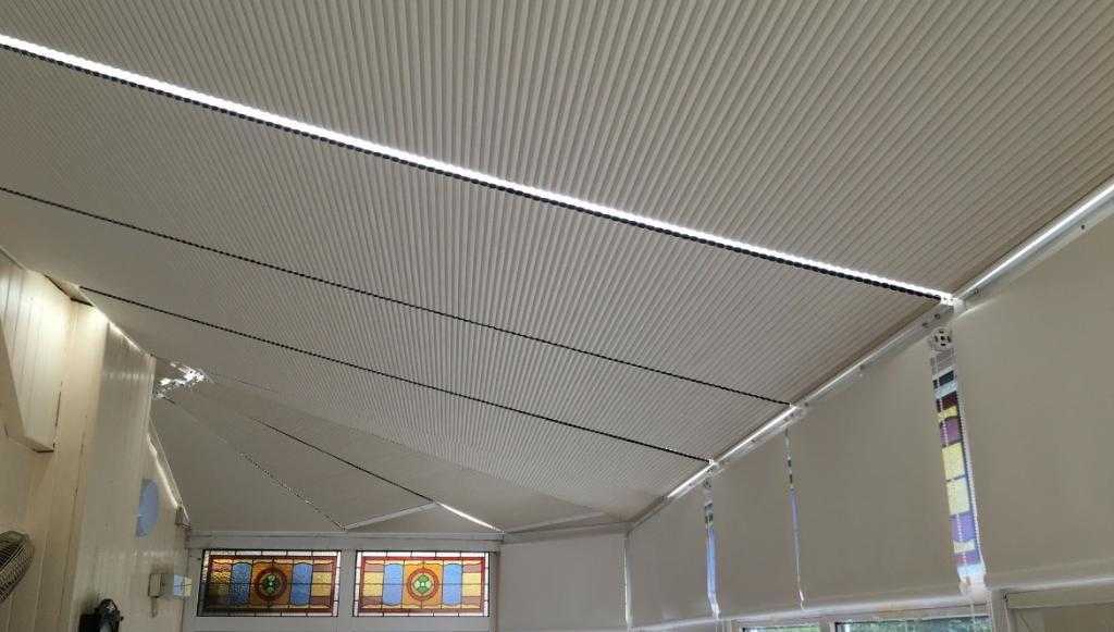 Комбинации различных материалов и фактур позволяют создавать очень необычные и интересные навесные и натяжные конструкции.