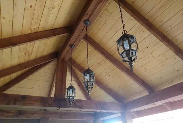 Выбирая, чем обшить потолок в беседке, расположенной на улице и обратив внимание на дерево, стоит учесть, что оно подвержено воздействию вредителей, а также не слишком хорошо переносит влажность. Поэтому, все поверхности, собранные их этого материала, нудно подвергнуть обработке специальными составами, которые не дадут вредителям повредить покрытие и уберегут его от воздействия влажного воздуха