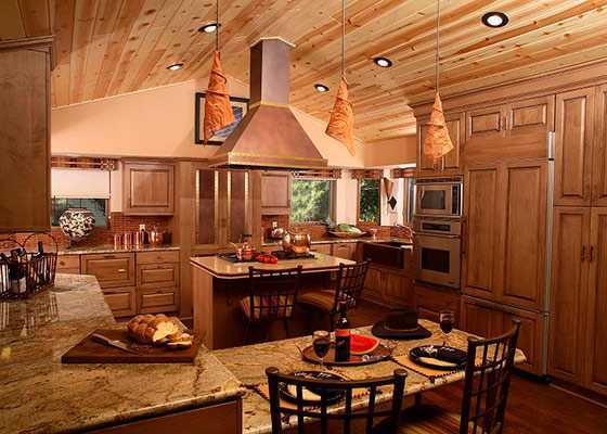 Очень симпатично в доме смотрится и деревянная вагонка. Да, это вам не гипсокартон. Такого многообразия форм и потолочных фигур из деревянных реек не вырежешь, но в живом материале свои прелести.
