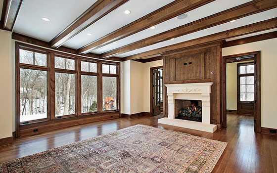 А вот так могут выглядеть потолки из гипсокартона, где в качестве основы взяты деревянные балки.