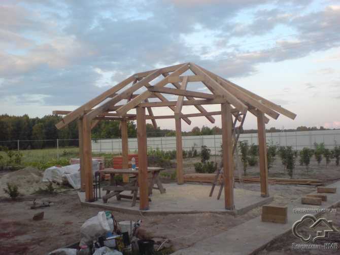 Инструкция по возведению деревянной крыши на шестигранную беседку указывает, что она состоит из шести одинаковых треугольников или шести разносторонних треугольников, грани которых сходятся в центре в одной точке, что напоминает по виду классическое восточное сооружение древности.