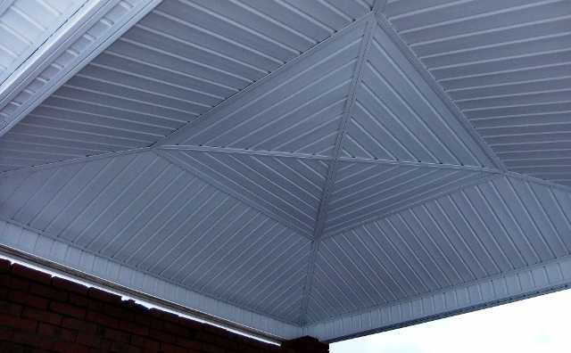 В остальном, этот материал соответствует основным требованиям и обойдется подобная отделка не слишком дорого. После сборки потолочной композиции, ее можно покрыть обычным влагостойким и морозостойким лаком для наружных работ или окрасить подходящей краской.