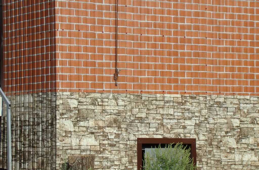 Профлист с рисунком под кирпич имитирует облицовку камнем. Эффект создается сочетанием соответствующего рельефного узора и окраски. Для окрашивания выбирают составы прочные, устойчивые к действию ультрафиолета и температуры.