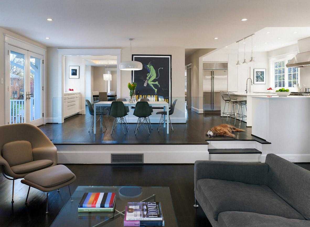 Прозрачная конструкция, размещенная между кухней и гостиной, позволяет увеличить угол обзора, расширить границы пространства и просто придать комнате дополнительного очарования.