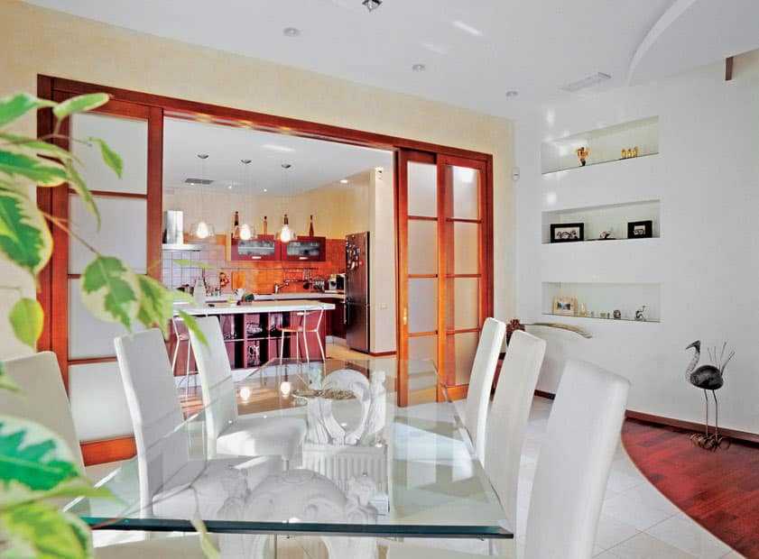 Если проемы расположены на смежных стенах в непосредственной близости, двери могут занимать одно и то же пространство, но оно больше не сможет выполнять какие-либо другие функции. Разве только украсить угол большим вазоном с живым растением. Поэтому в большинстве случаев дизайнеры предлагают установить раздвижные конструкции. Но на принятие решения влияет как расположение проемов, так и их ширина. Проходная гостиная с широкими проемами, больше похожими на арки, будет маленьким островком для отдыха в огромном пространстве всего дома или квартиры.