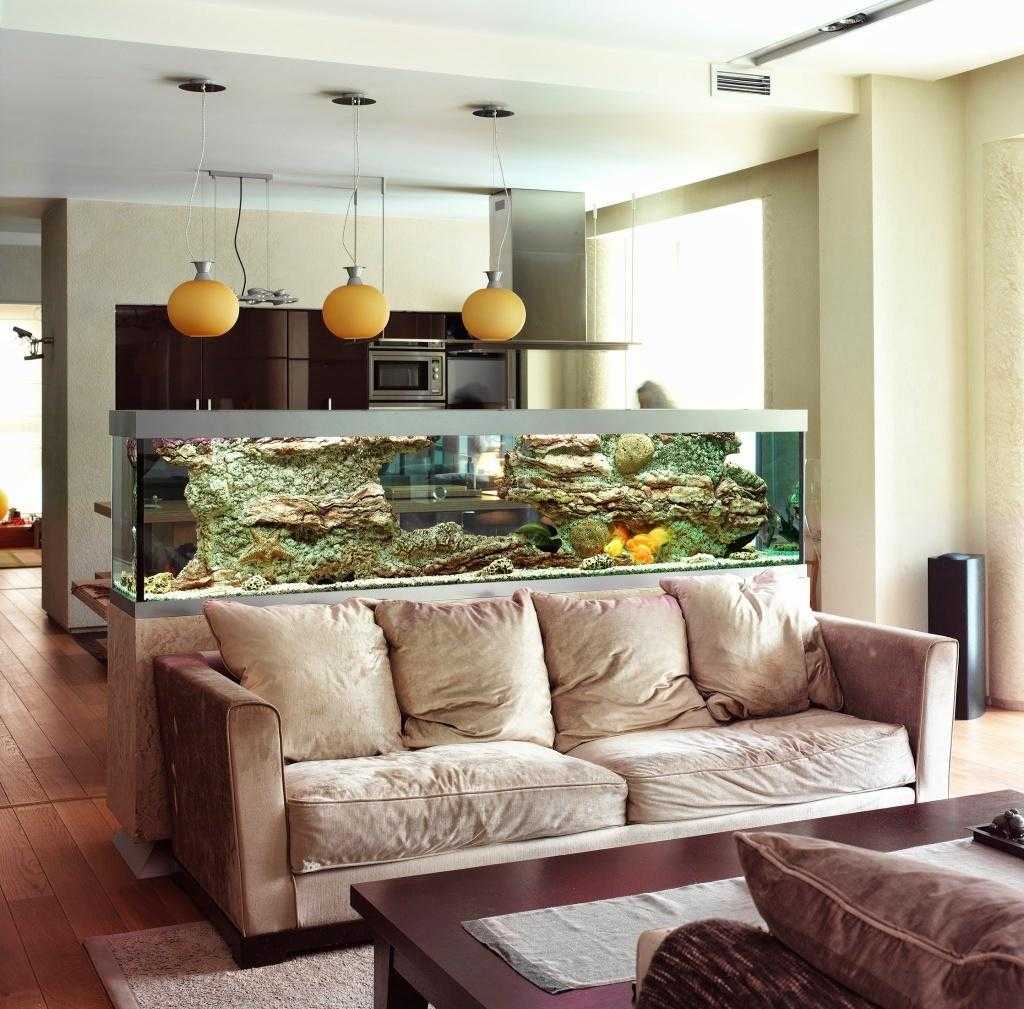 Данная идея является одновременно и элементом зонирования, и украшения гостиной. Но подойдет только для просторных помещений. Для кухни-гостиной средних размеров можно отыскать узкие аквариумы, которые не повлияют на восприятие размеров комнаты.