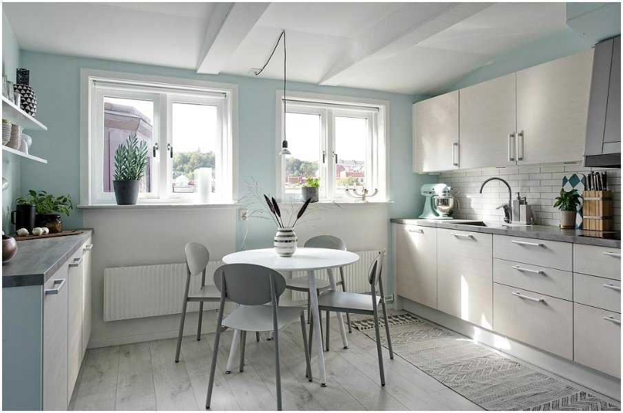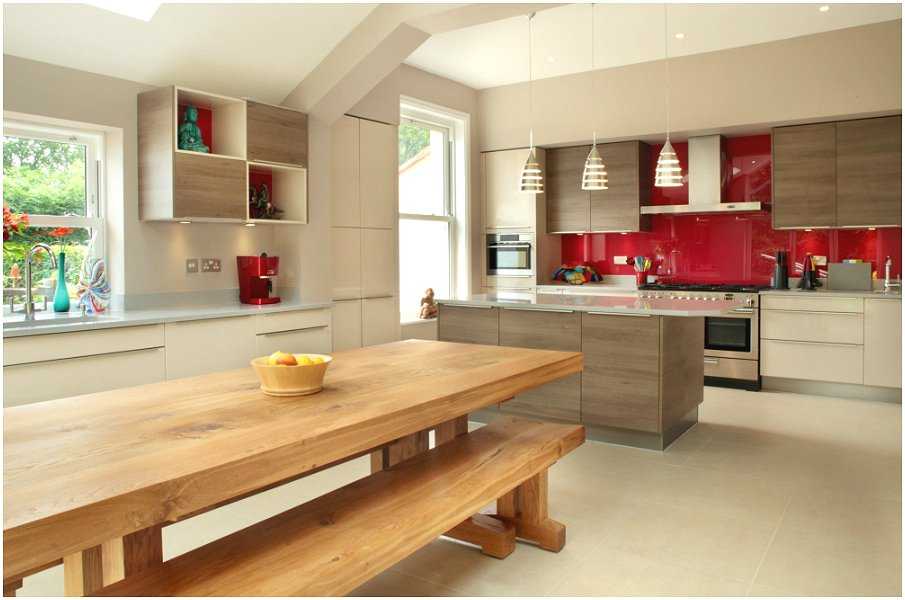 Оттенки синего и зелёного идеально смотрятся на фоне нейтрального бежевого цвета. Кухни с подобным оформлением выглядят стильно и гармонично. Сочетания этих цветов с бежевым подходят как для традиционных интерьеров, так и для современных дизайнов. Насыщенность цветового оформления подбирается в зависимости от стилистического направления и размеров кухни.
