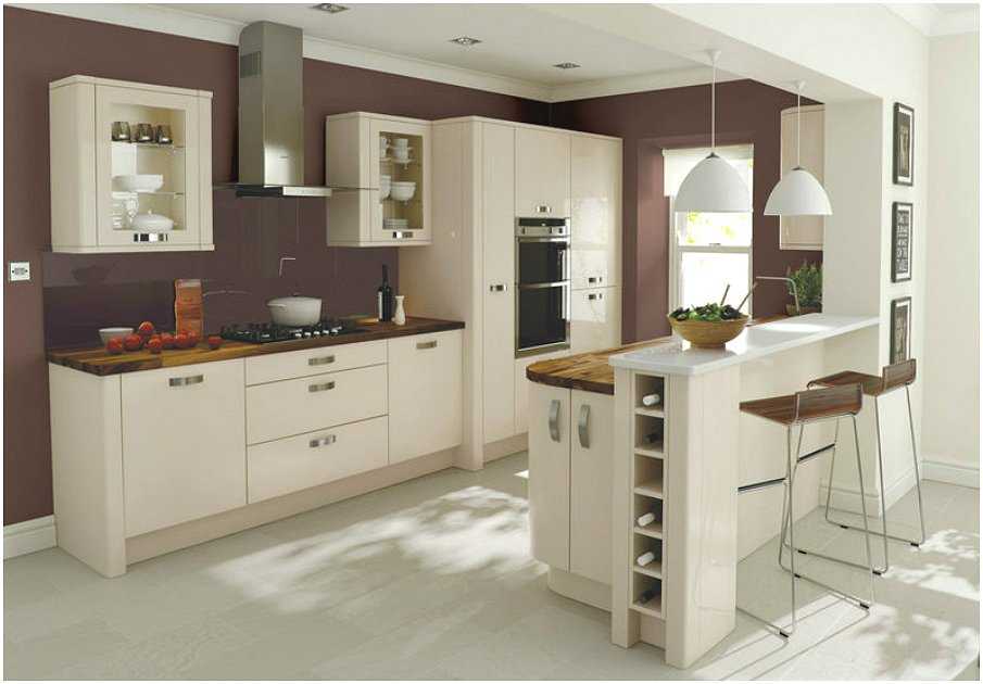 Бежевый цвет кухни гармонично сочетается с коричневым. Вы можете получить множество комбинаций, используя разную степень интенсивности оттенков. Классический пример бежево-коричневой кухни: светлое оформление помещения и гарнитур цвета венге.