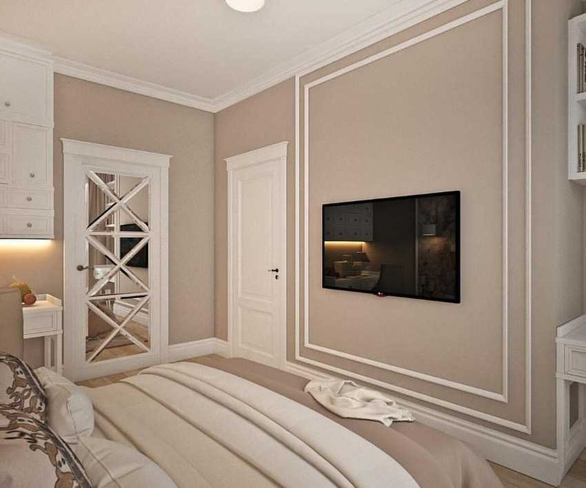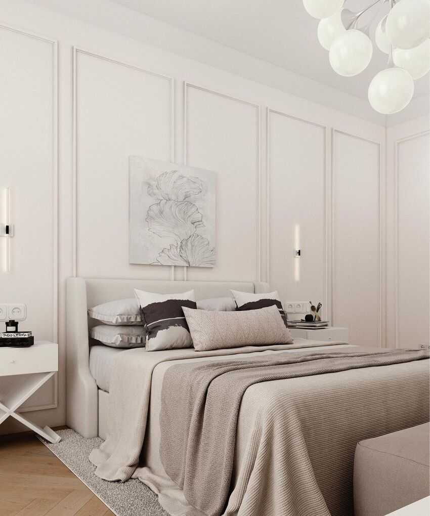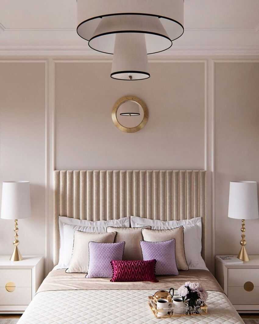 В этой комнате стена отделана молдингами в духе неоклассики и декорирована молочно-белой краской. Этот тон идеально сочетается со столь актуальным сейчас пудровым тоном обивки изголовья.