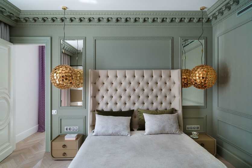 Например, в спальне по проекту Марии и Никиты Бахаревых привлекает внимание нежно-зелёный оттенок, которым окрашены и стены, и карнизы, и молдинги. Он отчасти нивелирует массивность карнизов