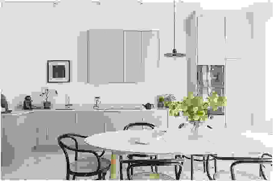Фасады кухни (индивидуальный проект, выполненный по эскизам архитекторов) выкрашены в нежнейший оттенок зелёного, гармонирующий с паркетом и мебелью из дерева тёплых тонов. Обеденная группа, Conran Shop.