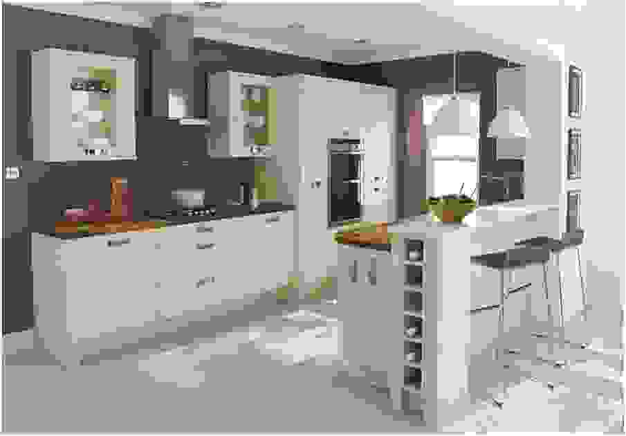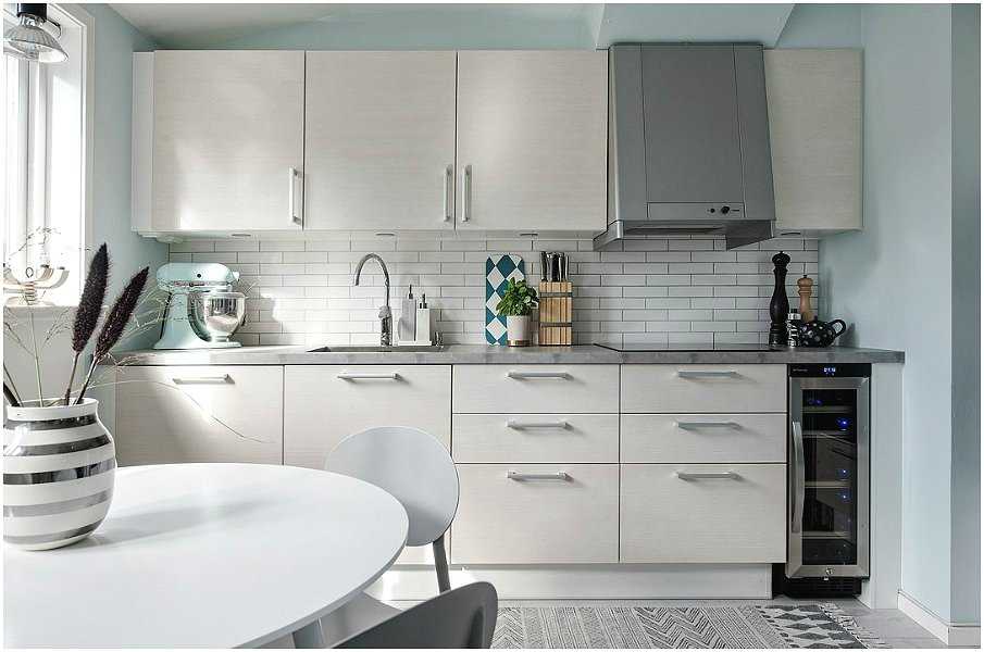 На фоне бежевых стен прекрасно смотрится гарнитур нейтрального серого цвета, который дополняет бытовая техника из нержавеющей стали. Это сочетание уместно как в просторных помещениях, так и в небольших кухнях.
