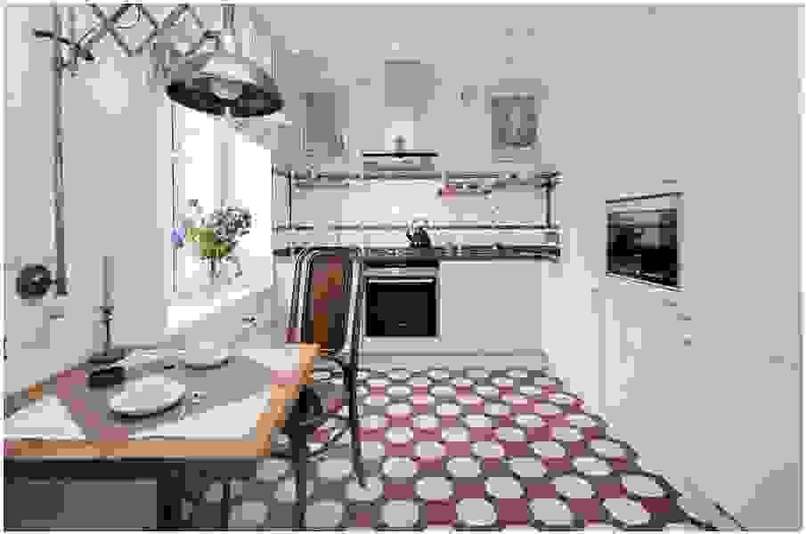 Пудрово-розовый цвет на фрагменте стены и потолка отделяет столовую от жилого помещения.