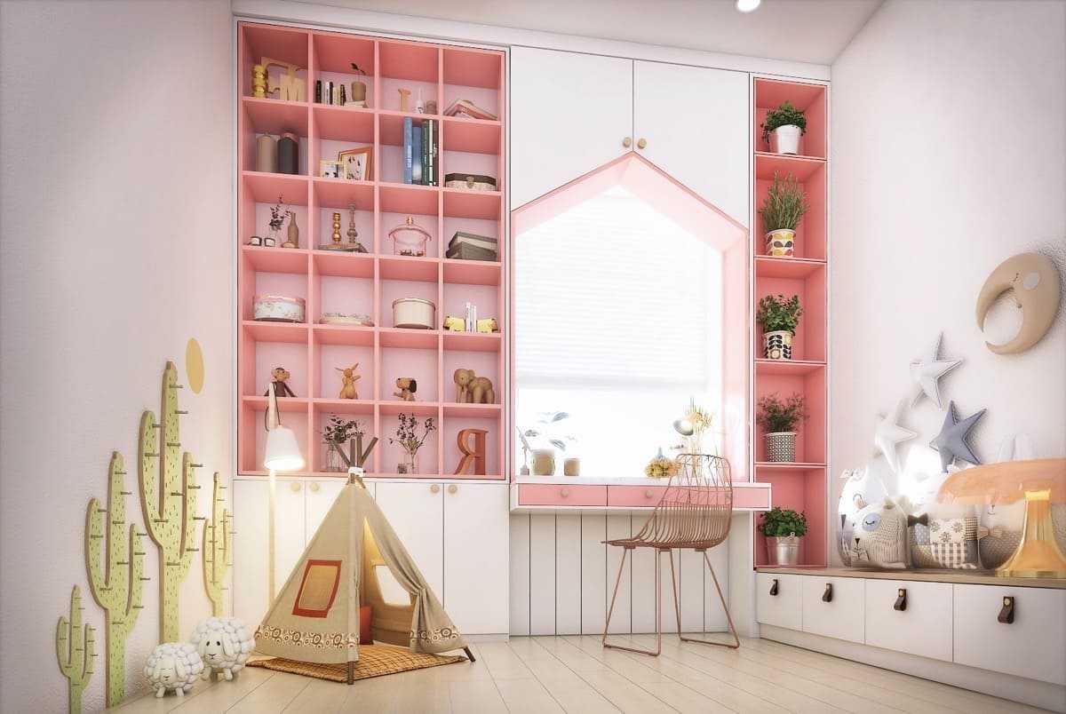 Стеллажи для комнат девочек должны быть выкрашены в ярко-розовый, красный или вишневый цвет. Имейте в виду, что полки и стеллажи должны быть безопасны и удобны, чтобы ребенок мог легко дотянуться до любимых вещей.