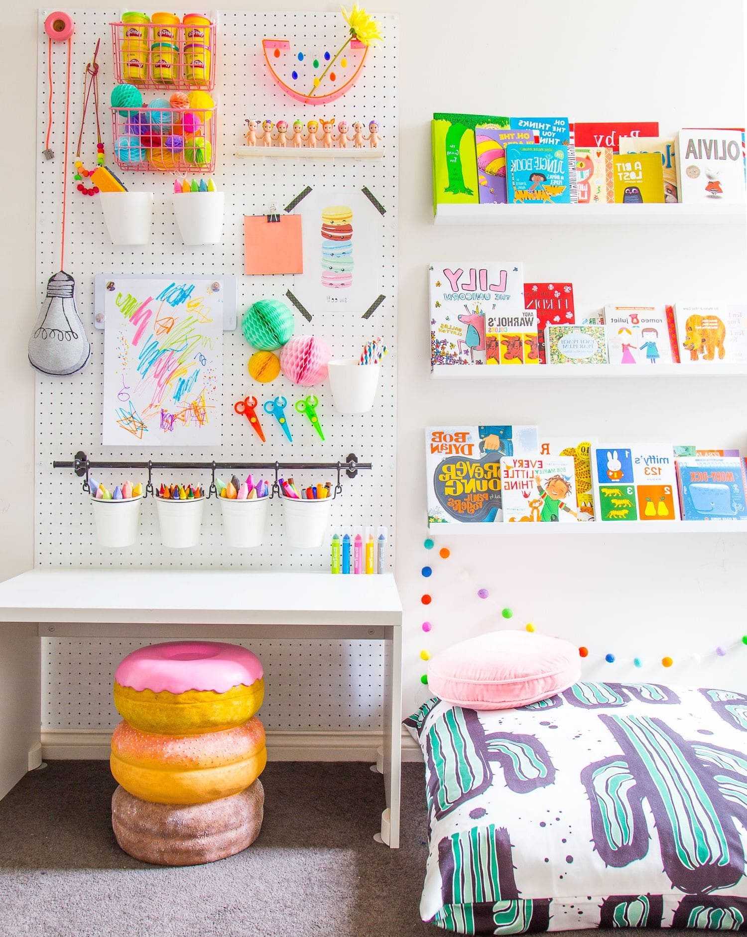 По мере того, как ребенок развивается и начинает изучать мир, у вас будет появляться множество рисунков и поделок вашего малыша. Используйте их для украшения комнаты.