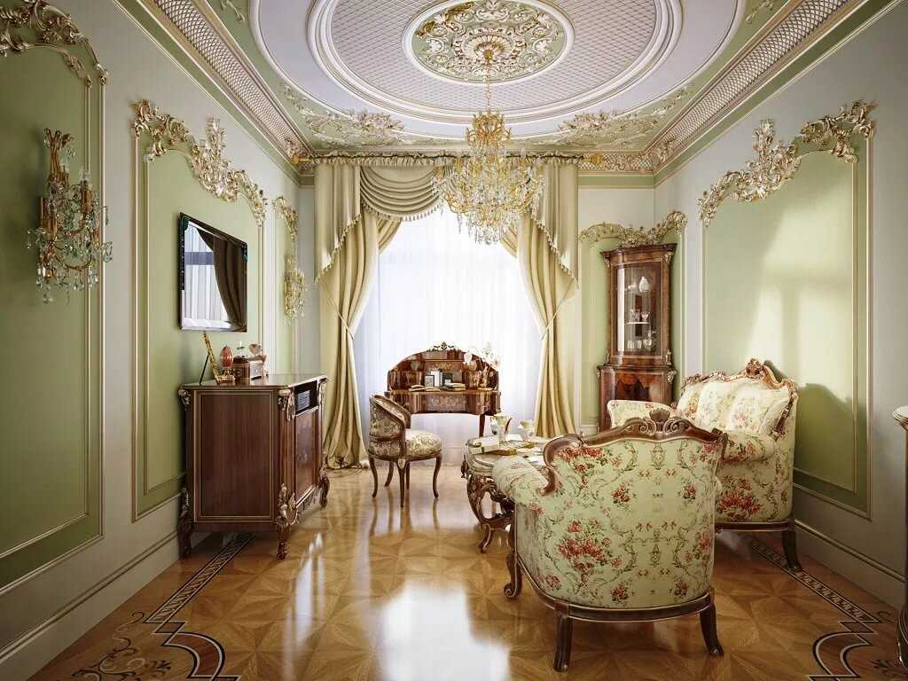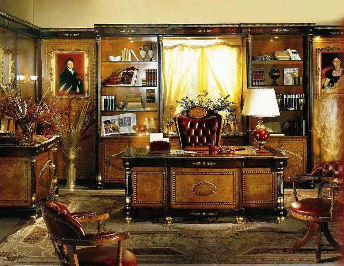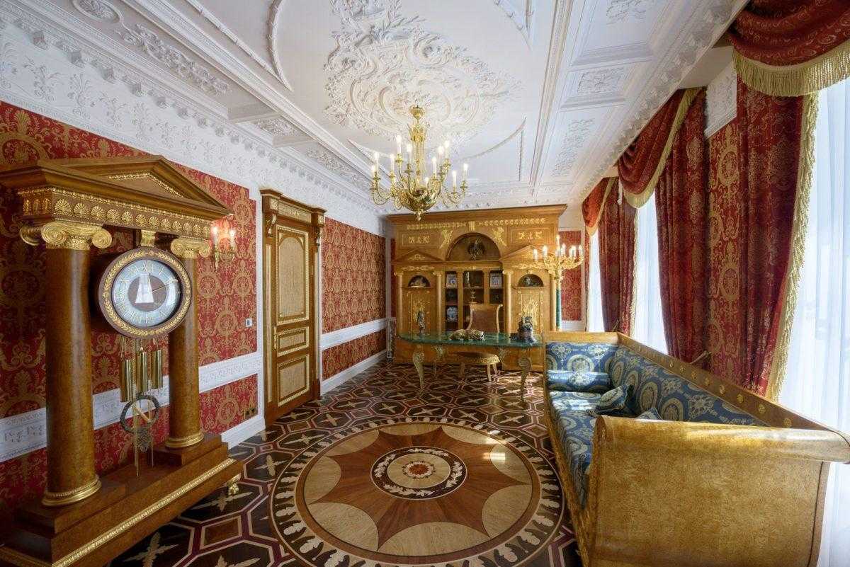 Такой стиль, конечно, сложно представить в обычной квартире, но и не в каждом частном доме он будет уместен. Оформление с таким торжественным дизайном выбирают для исключительных помещений, где есть место, чтобы развернуться с массивной мебелью, насыщенными оттенками, объемным декором, витиеватым орнаментом. При грамотном использовании ярких и величественных деталей обстановка получится достаточно благородной. Именно такая подойдет для реализации в кабинете руководителя высшего звена, конференц-зала, холла респектабельной гостиницы и, конечно, рабочего места президента страны.