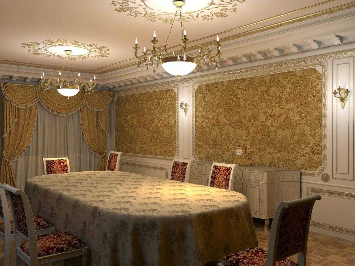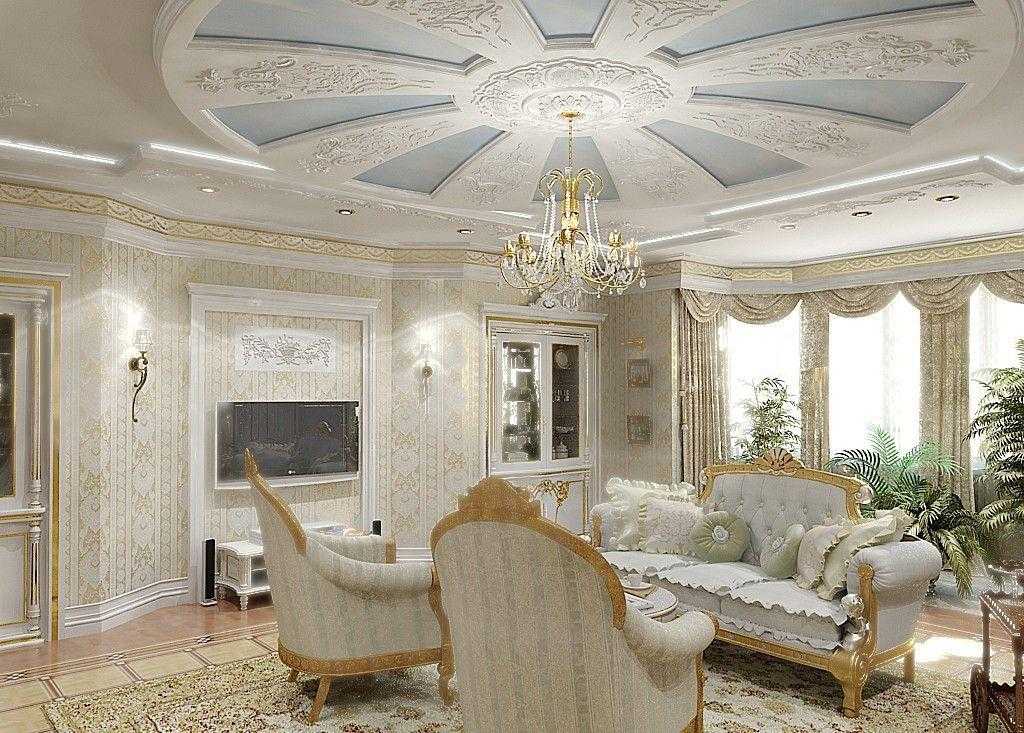 Потолок не менее важен. Для его оформления также нужно использовать только натуральные и дорогостоящие элементы. Строго по центру нужно разместить большую люстру из хрусталя. Вокруг главной детали потолок декорируется позолоченной лепниной. Колер, чаще всего, белый, но возможно допустить вольность, использовать для окраски материалы молочного или светло-бежевого цвета.