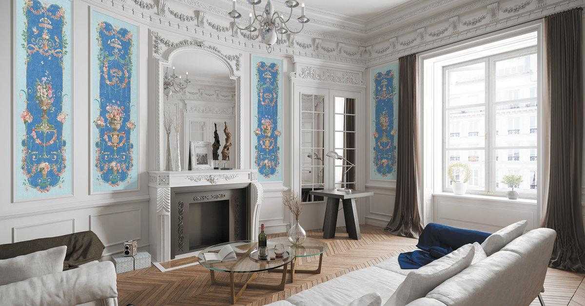 Поверхность стен зонировалась накладными лепными элементами в виде замкнутых рамок, покрытых слоем позолоты. Внутри зон располагали роспись, лепные элементы и ткань, вешали художественные полотна.