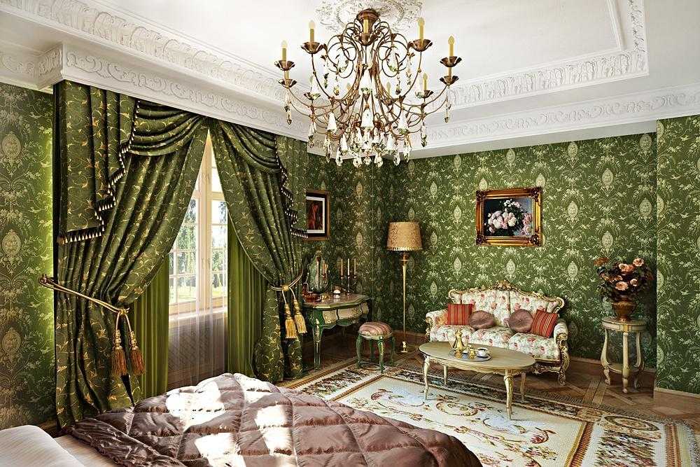 Второй вариант – стены полностью декорировались при помощи роскошных тканей – шёлк и парчи. Современный вариант отделки – текстильные обои высокого качества, имитирующие натуральную ткань.