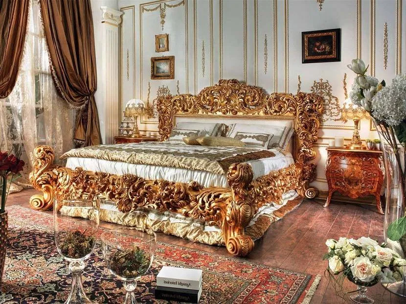 Позолота по периметру кровати и ее изголовью хорошо смотрится на фоне белых стенИсточник www.topdom.ru
