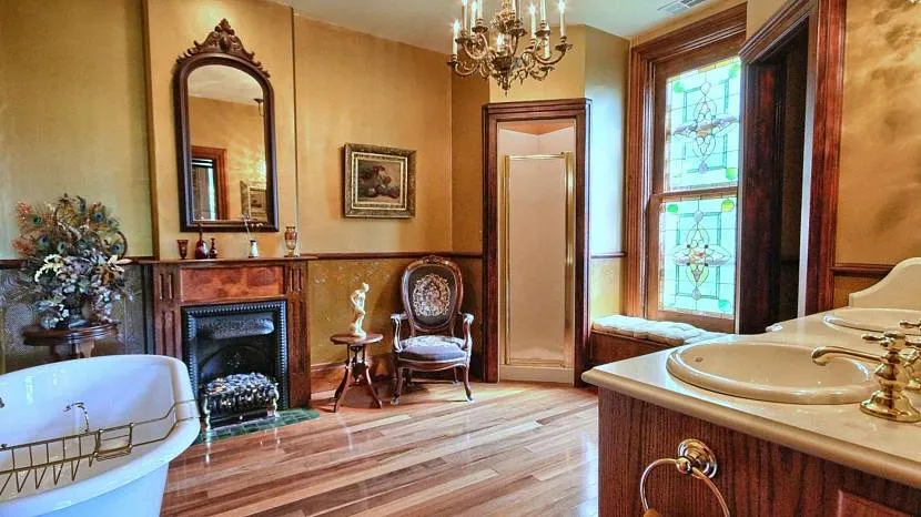 Здесь используют только роскошные и дорого смотрящиеся материалы – паркет из ценных пород дерева со сложным рисунком, натуральный камень – мрамор, травертин.