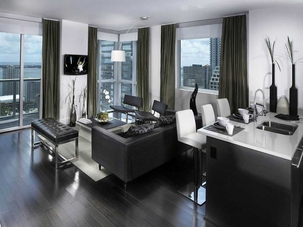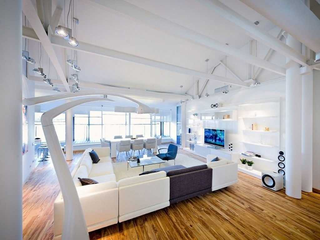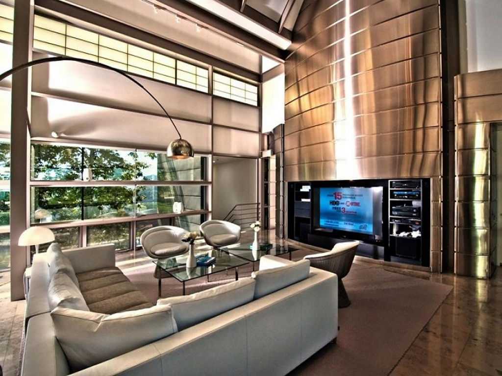 Техника оформления гостиной строится на цветовой гамме, состоящей из металлических оттенков, черных, чисто-белых и серых цветов. Яркие решения используют только для создания акцентных тонов. Данных оттенков в общем интерьере комнаты не должно быть слишком много. К тому же, наиболее популярная техника — это черно-белая цветовая гамма с легким серебристыми отливами. Панорамные окна и большой объем света, в сочетании с мягкой кожаной и функциональной мебелью, поддержит минимальную нейтральность обстановки.