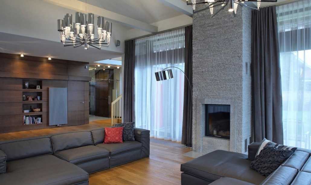 В большой и просторной комнате минимализм добавит свободы и подчеркнет незагруженность площади. Большие панорамные окна визуально удлинят потолок, диван из искусственной кожи и кресла привнесут уют в обстановку. Прекрасным дополнением может выступить камин, который будет не только ярким и акцентным элементом, но и, добавив в качестве обрамления серебряный пластик или же темный камень, станет стильным предметом уютного декора.