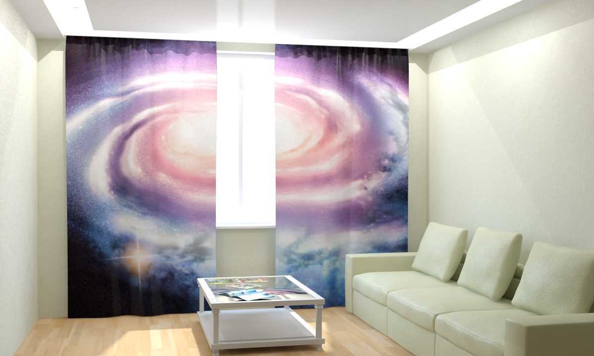 Гостиная в стиле минимализм: гардины классического кроя, портьеры — японского типа