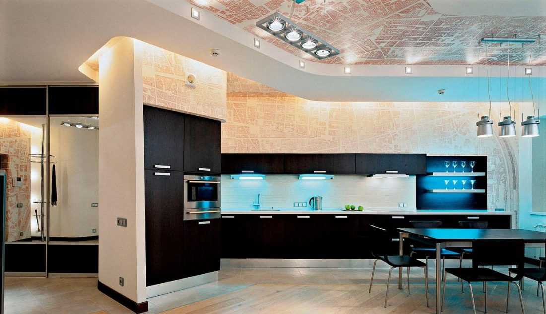 В кухне хай-тек, желательно устанавливать натяжные потолки с матовой поверхностью