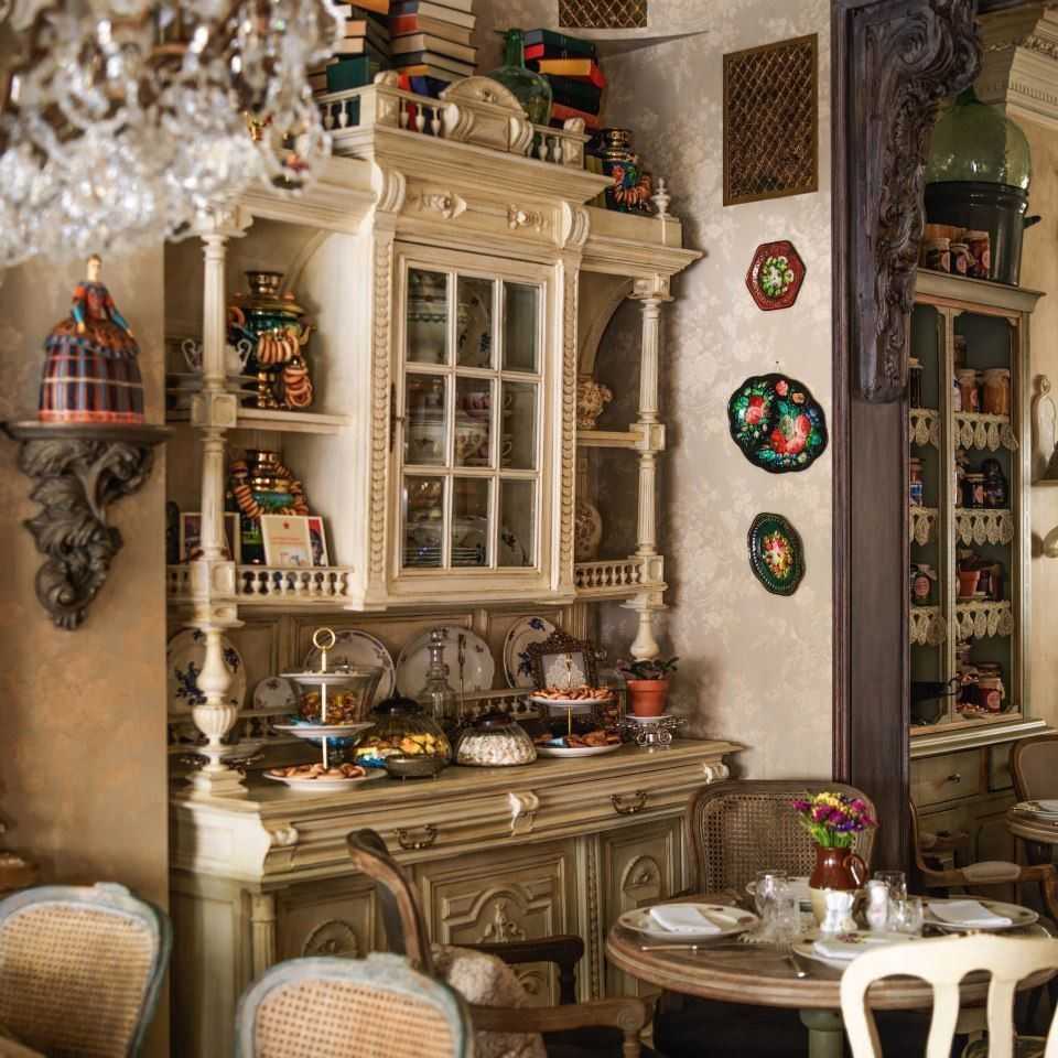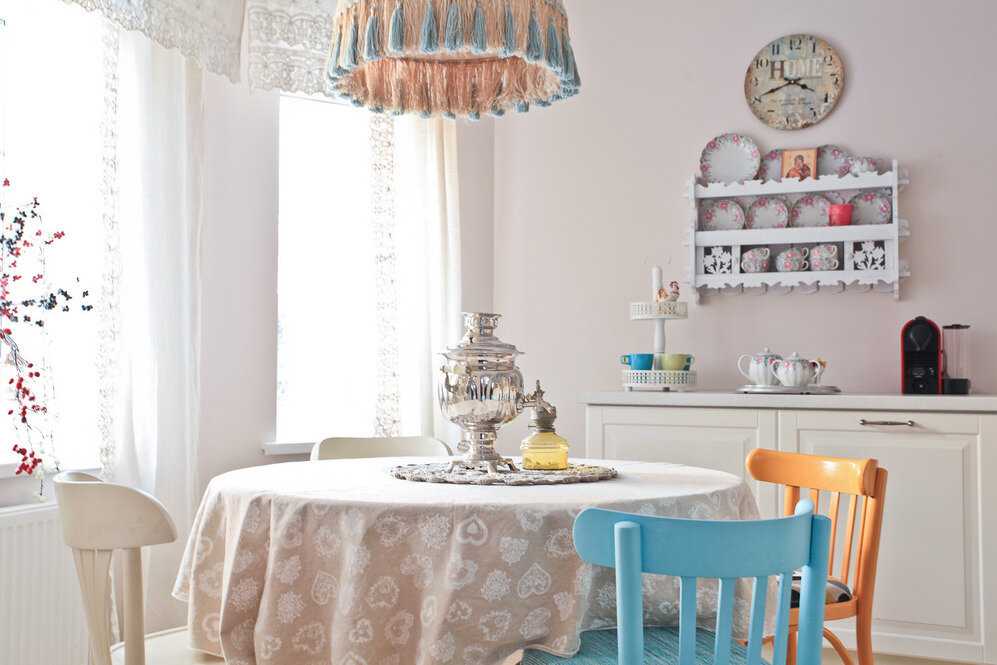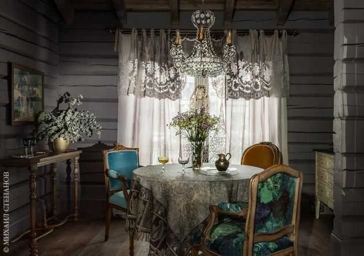 Особого внимания достоин и декор кухонных окон: льняная ткань с ручной вышивкой ришелье обрела вторую жизнь в качестве штор: «Этим шторам уже более ста лет и их реставрация была серьезной работой для мастериц».