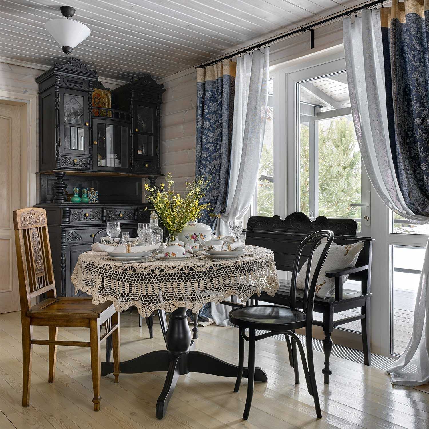 Еще одна дачная кухня в стиле a la Russe. “Эта была типовая маленькая дача из бруса, отделанная сайдингом снаружи и желтой вагонкой внутри, – рассказывает дизайнер Ирина Лаврентьева. – Но мы влюбились в это место с яблоневым садом и сразу же затеяли переделку”. В первую очередь сайдинг был заменен на деревянную обшивку, а внутри вагонку частично заменили на новую, частично отциклевали старую, перестелили полы натуральными досками из лиственницы. Обустраивая свой небольшой дачный домик, Ирина удачно использовала бабушкино наследство. Деревянная резная скамья и старинные стулья заняли почетное место на кухне, составив идеальную пару английскому антикварному буфету. А массивный обеденный стол был отреставрирован и выкрашен в черный цвет, превратившись в удобный письменный стол.