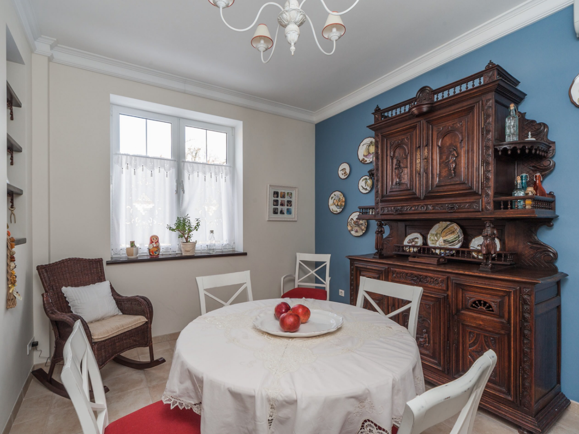 В этом доме многое сделано своими руками. Например, на старых стульях заменили обивку и покрасили их в более современные цвета. А на кухонной мебели ИКЕА появились ручки из состаренного олова, привезенные из Америки.