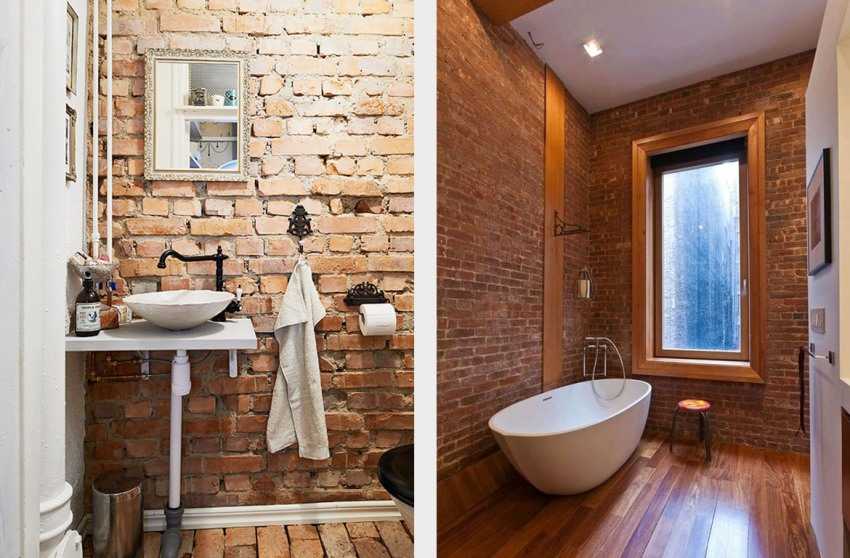 Благодаря влагостойкости и устойчивости к перепадам температур, кирпичную отделку разрешается применять в помещениях с повышенной влажностью. Так, кирпичная стена или имитация кирпичной кладки отлично впишутся в интерьер ванной комнаты.