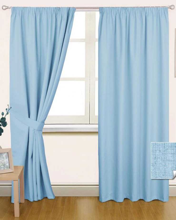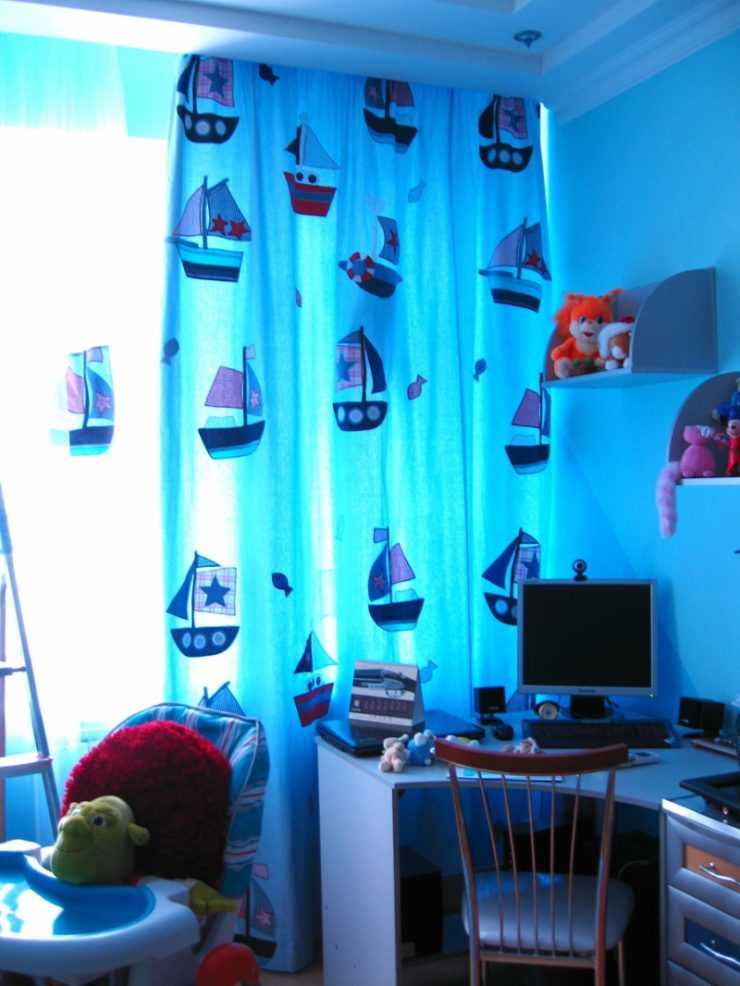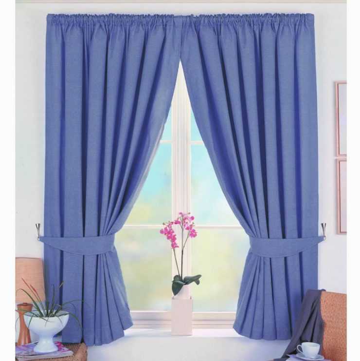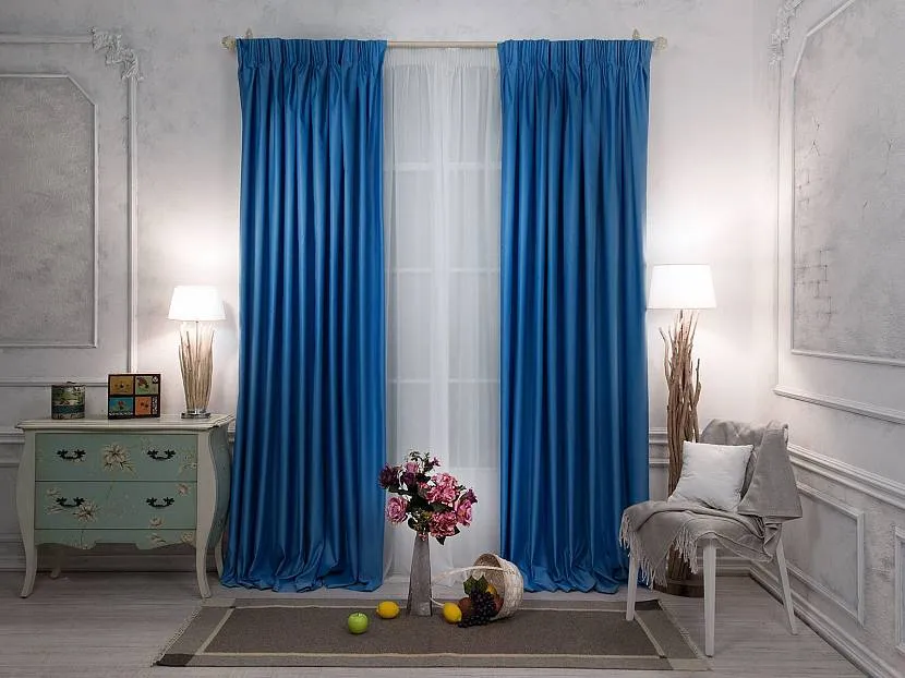 Если обои в комнате украшены узорами, то лучше использовать однотонные синие шторы на окнах. Если же настенное покрытие без принта, то украсить синие занавески можно легким геометрическим узором. Также не стоит забывать, что лучше использовать темные оттенки в больших комнатах, и светлые в маленьких.
