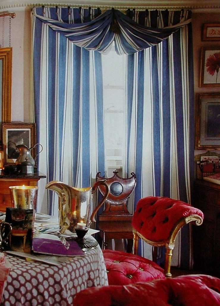 Морской интерьер сложно представить без бело-голубой или бело-синей полоски, комбинация подчеркнет тематику интерьера. С помощью штор в полоску можно визуально скорректировать пространство, делая его шире или выше, в зависимости от направления полос.