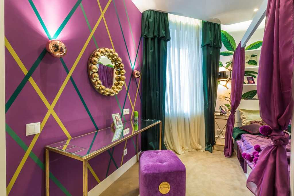Подобное сочетание двух цветов позволяет создать девичий и гламурный интерьер. Бледно-фиолетовые цвета можно комбинировать с пурпурным, а лавандовые и сиреневые оттенки дополнить контрастным цветом фуксия.