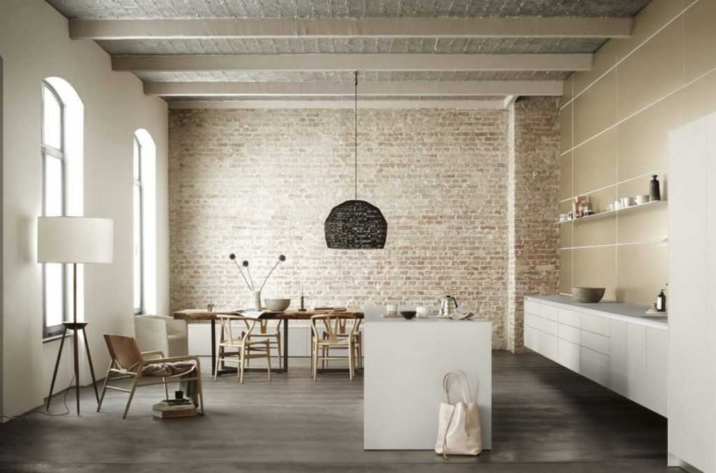 Для стиля лофт подойдут высокие потолки в помещении, он предполагает пространство и отсутствие перегруженности мебелью и предметами интерьера. Грубая кирпичная кладка будет стильно смотреться с лаконичной современной мебелью, а домашний уют создается с помощью аксессуаров и правильно подобранного освещения. Кирпич хорош в интерьере кухни гостиной, например, в квартире-студии.