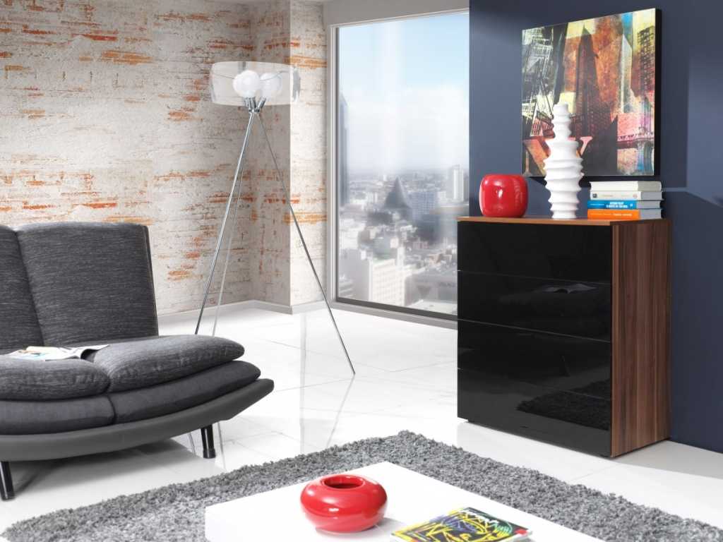 Главная цель – разбавить темноту более приятными глазу оттенками. Предлагаем сыграть на контрасте, но не на скучном белом, а с добавкой песочного, лимонного, светло-голубого или малинового. Перечисленные цвета принесут уют и уберут все внимание с изделия черного цвета. В качестве отделки хорошо подойдет ламинат серого цвета, а если поверхность комода – глянец, то и пол может соответствовать заданной стилистике;