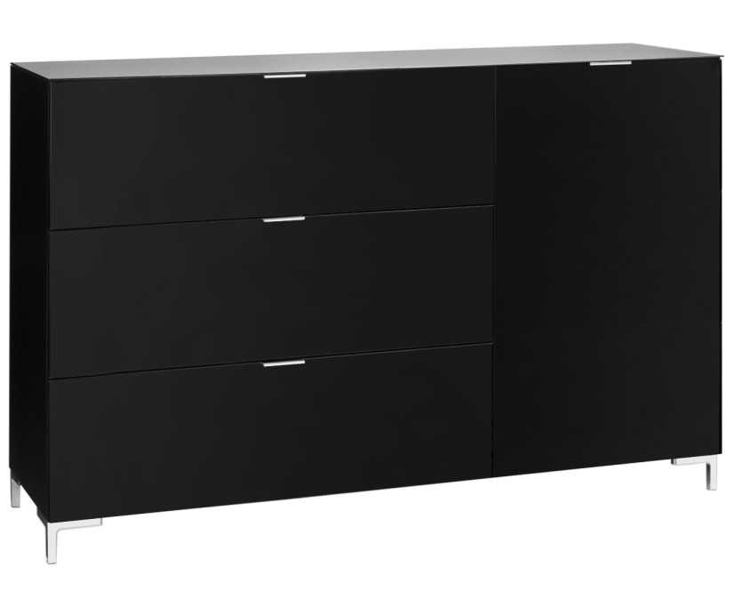 Дополнительное изящество черным комодам придают материалы вставок: металл, пластик и стекло. Поверхности изделий могут обрамляться стеклянными вкраплениями, боковые части фасадов элегантно декорируются металлическими рамками, а ножки выполнены из хрома. Выбирайте комоды с дополнительной обработкой кромкой АВС, тогда изделие прослужит гораздо дольше.